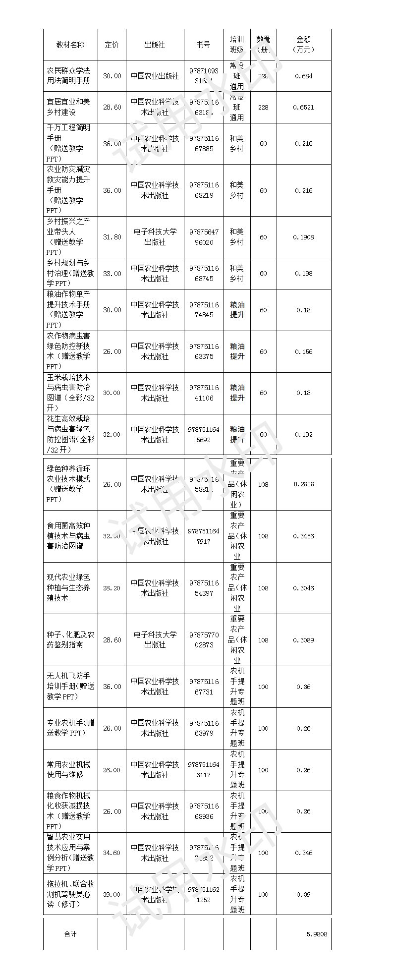 襄阳职业技术学院农学院承担2025年襄阳市直高素质农民培训任务,培训人数328人,培训班级6个,需要为参训学员提供教材,培训教材列表附后,采购预算:59808元,采购方式:询价。参与的供应商应于2025年10月28日上午10点前携带样书,在高铁南路校区嘉禾楼302室提交询价响应文件。特此公告。