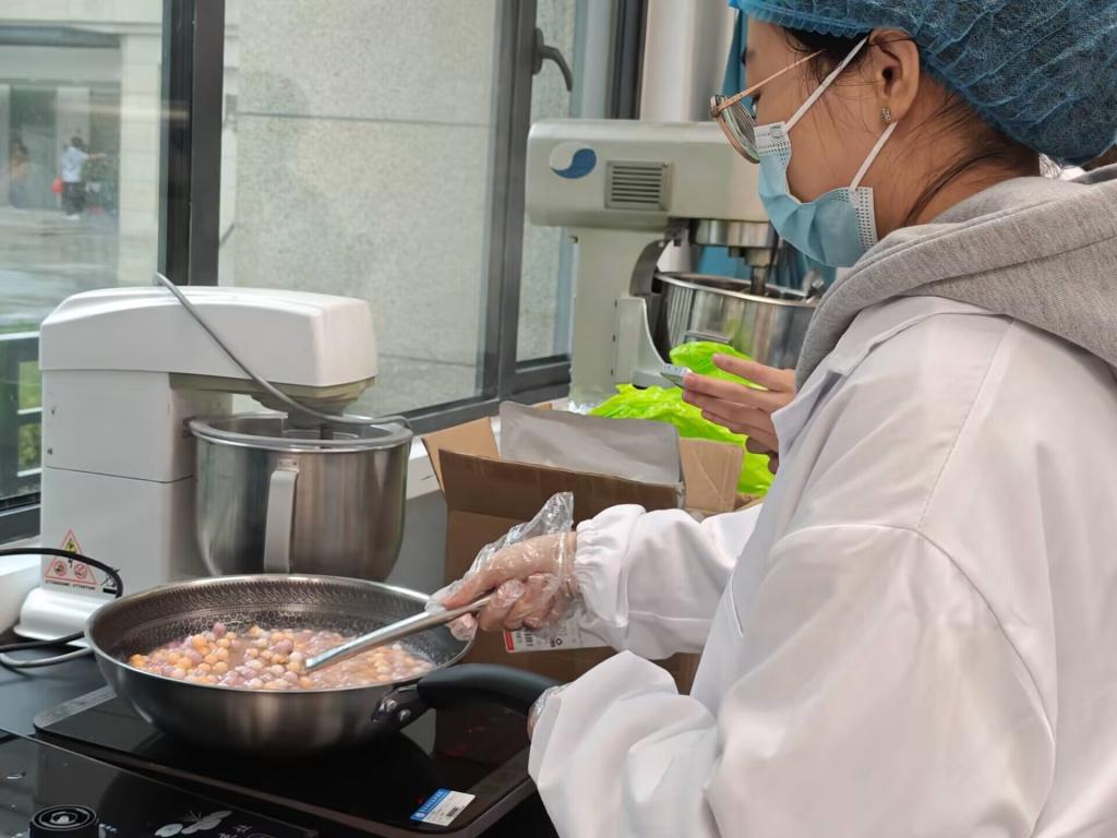 活动现场香气扑鼻,茶叶、牛奶、珍珠、芋泥等食材整齐摆放,瞬间勾起大家的创作欲。煮茶、调奶、加配料,从经典款到创意款,同学们各显神通,有的搭配Q弹珍珠,有的解锁芋泥麻薯双料,忙得不亦乐乎。