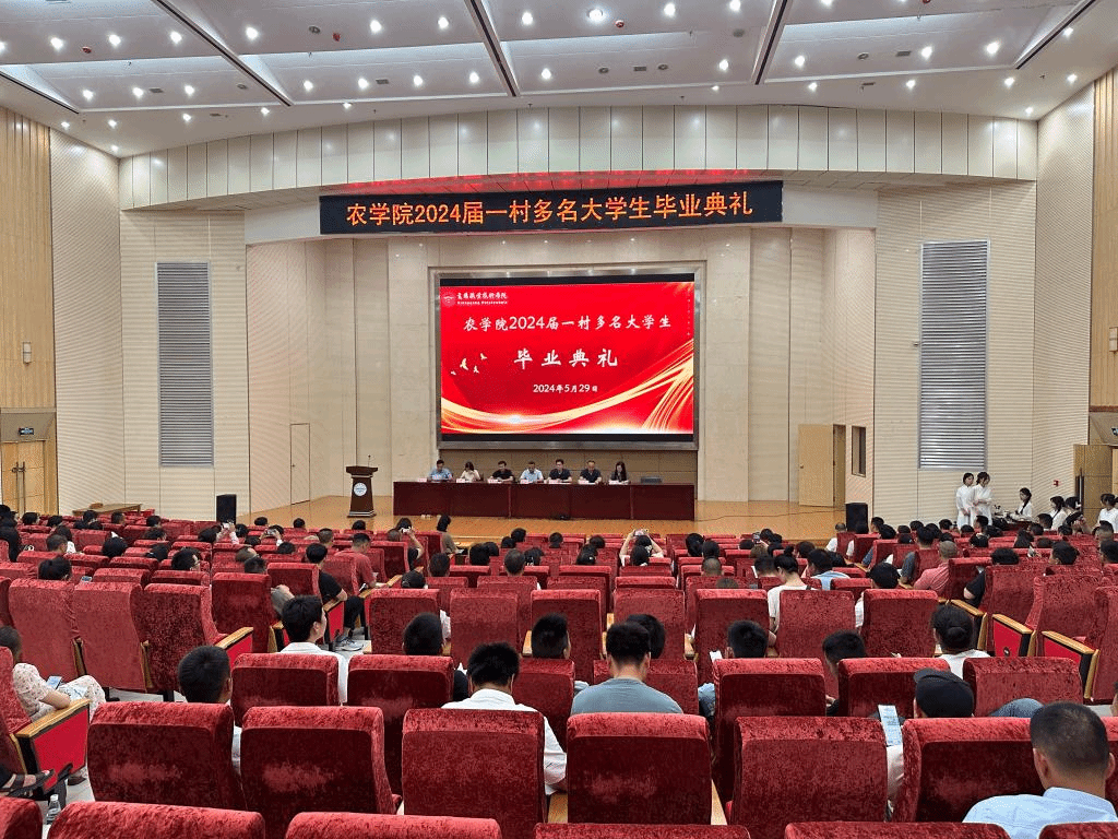 5月29日下午,农学院举办2024届一村多名大学生毕业典礼。学校招生处副处长周君国、教务处副处长周秀丽、学工处副处长赵良虎,农学院党总支书记汪志涛、院长赵劲松,副院长陈杰军、杨莎,农学院全体教师以及192名毕业生于图书馆二号报告厅参加本次典礼。
