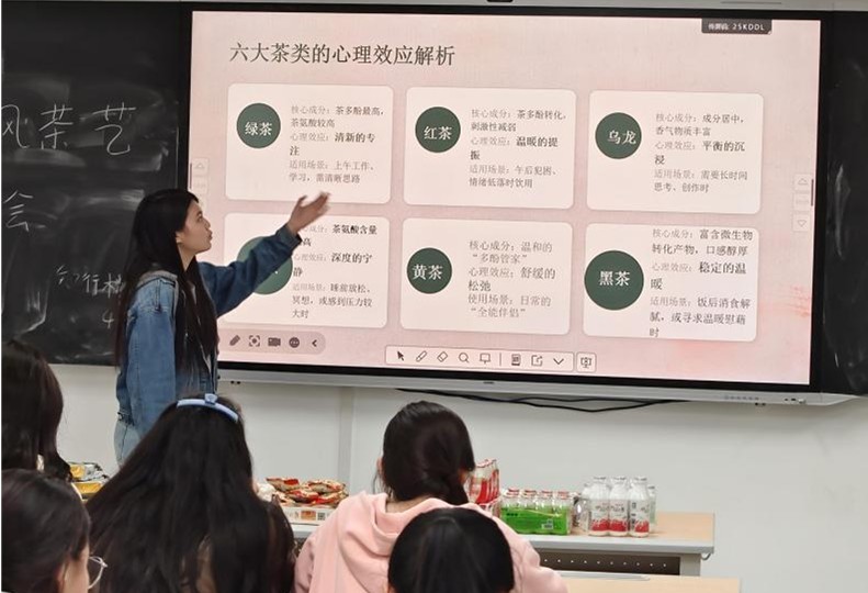 活动中,主讲人系统介绍了六大茶类的制作工艺与风味特征。随后,学生逐一品鉴各类茶汤,在悠扬的筝乐声中静心观色、细品滋味,通过"身心对话"环节交流品茶心得,在慢节奏的茶艺实践中舒缓身心压力,感受不同茶类带来的情绪共鸣。